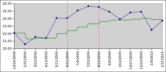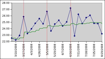 Then I installed a \”Cup-a-Joe\” (stainless measuring cups with about 1/8\” spacing) and drove almost 10,000 miles. Averaged 24.6MPG, an 11.5% increase over the 22MPG baseline. I noticed a fractal in the data (red lines) every 6th tank. Possibly related to oil changes? The green trendline seemed to be increasing over the 5 months.